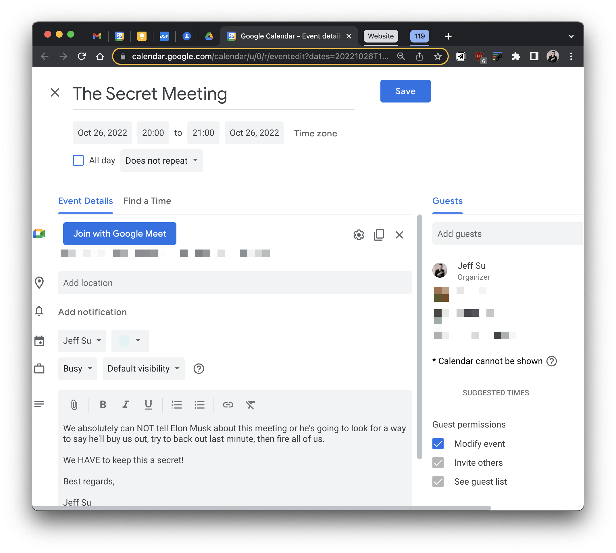 A new Calendar event will appear. The email subject line will be the event title, the body of the email will be added to the description field, and all recipients (excluding bcc) will be added to the invitee list