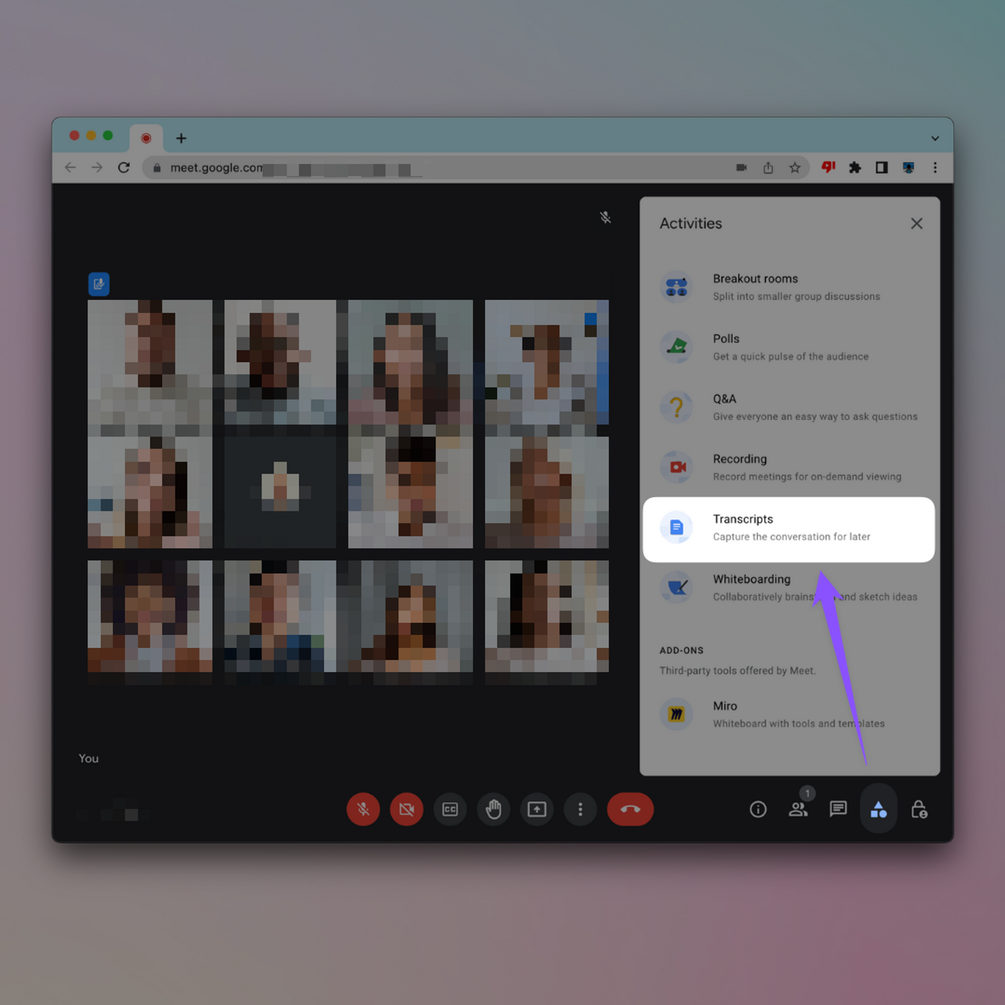 From the “Activities” menu, simply click the “Transcripts” option to initiate the transcribe feature