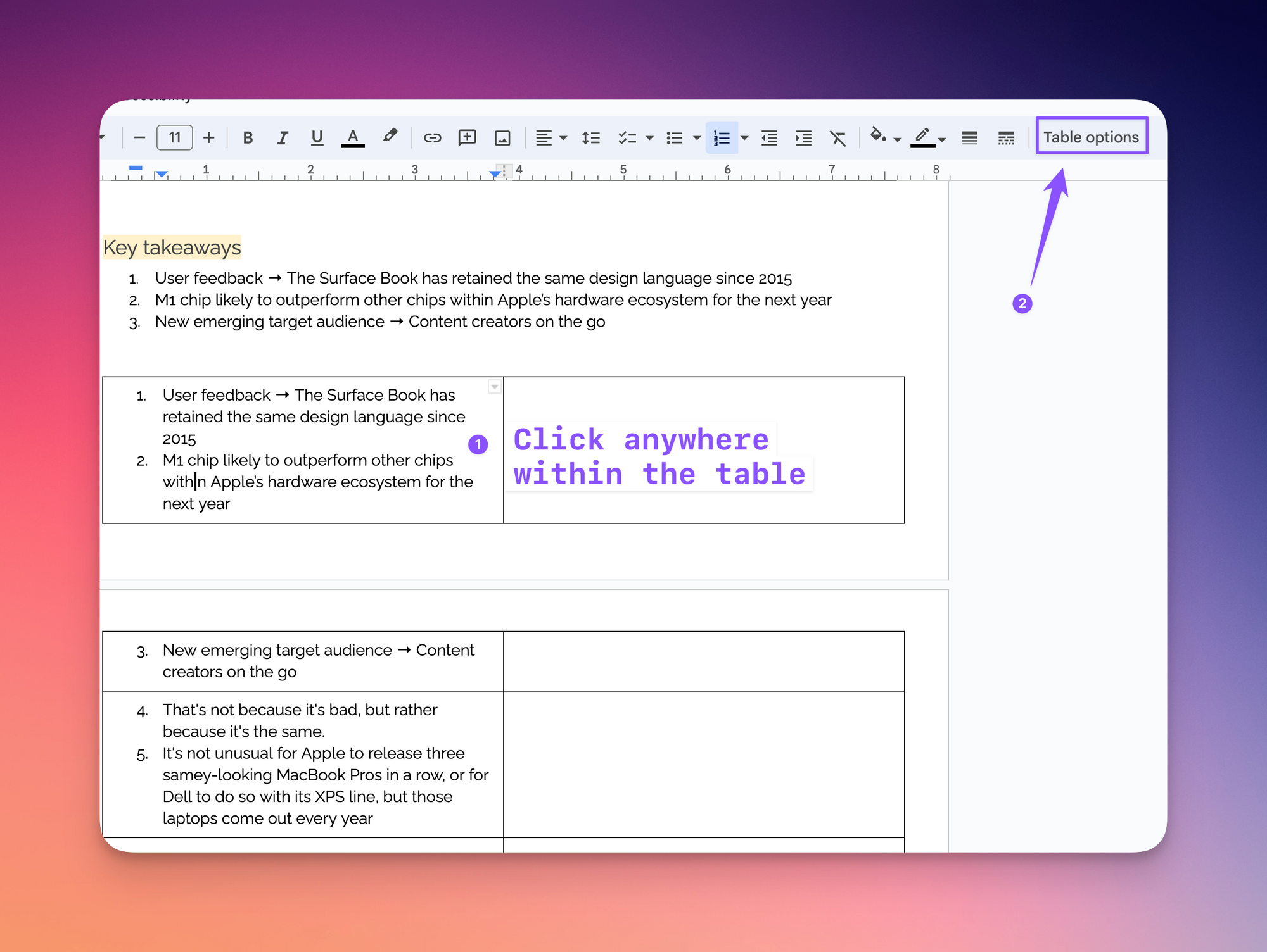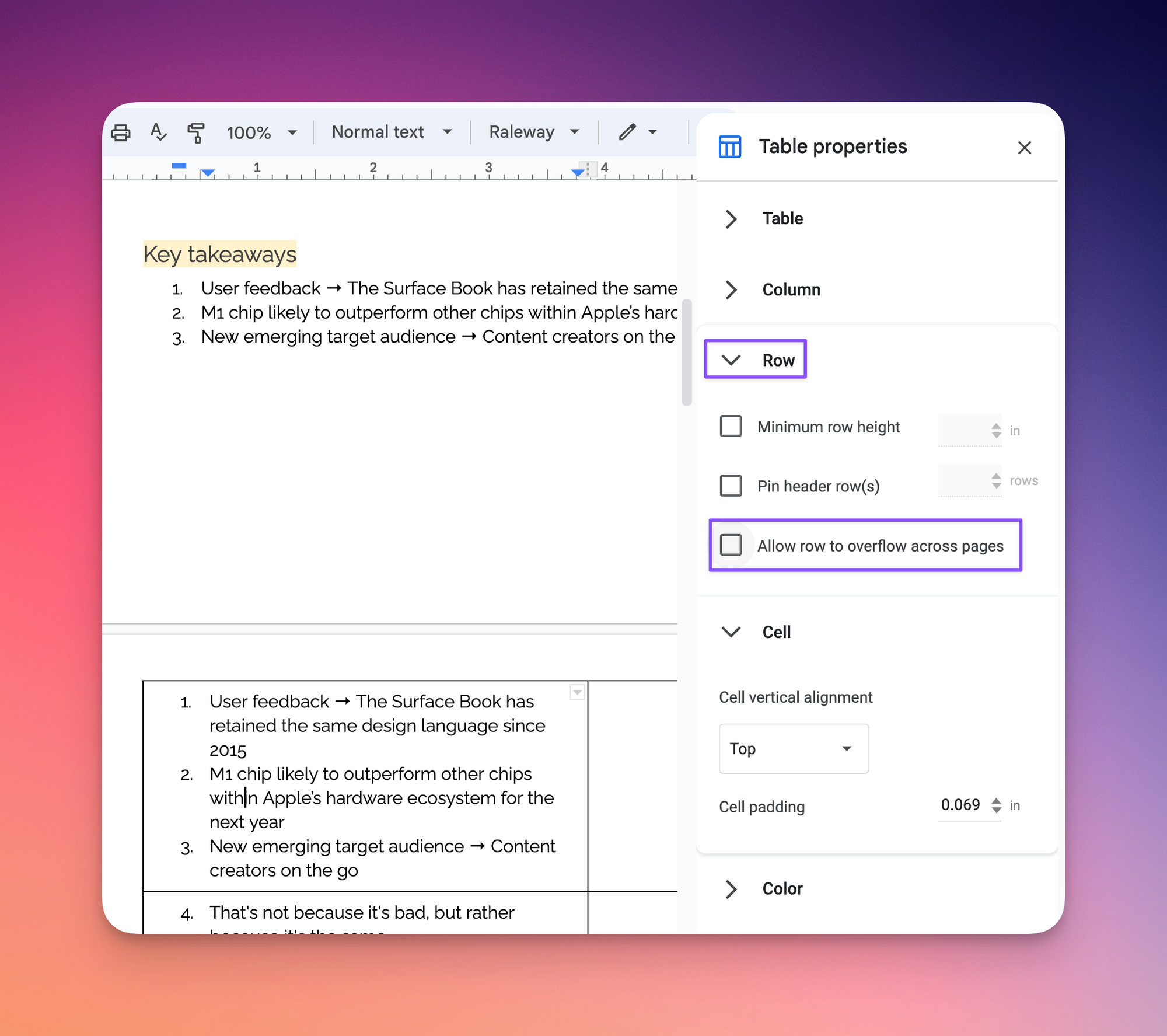 To combat this, click anywhere within your table > Table Options > Row > Uncheck “Allow row to overflow across pages”