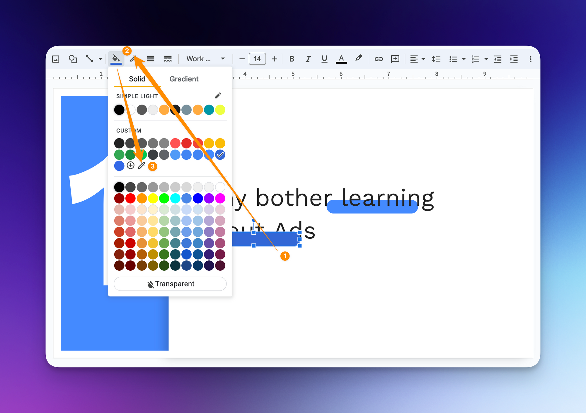 Previously, if you wanted to use a specific color in Google Slides (to match another element for example), you had to: