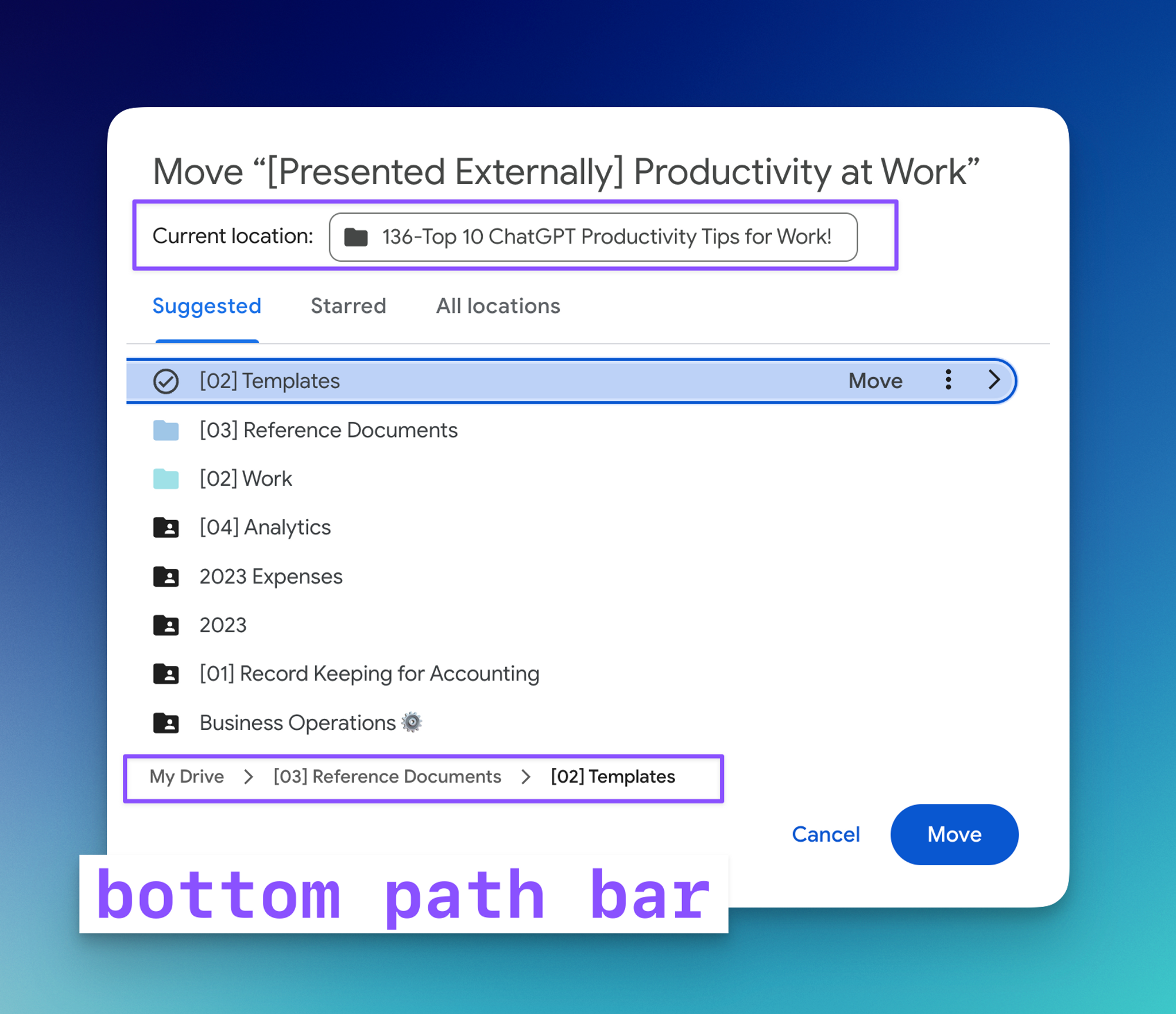 But to make this feature more effective, once the file is highlighted, press "a" to access the Quick Actions Toolbar and select 'Move to'