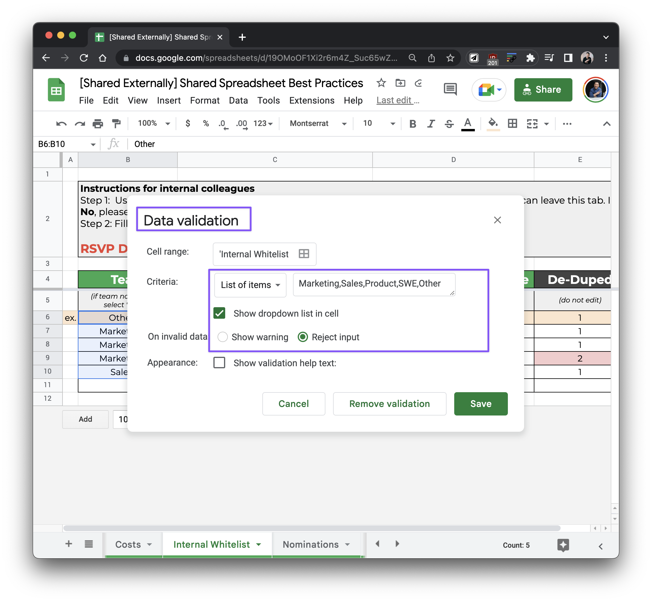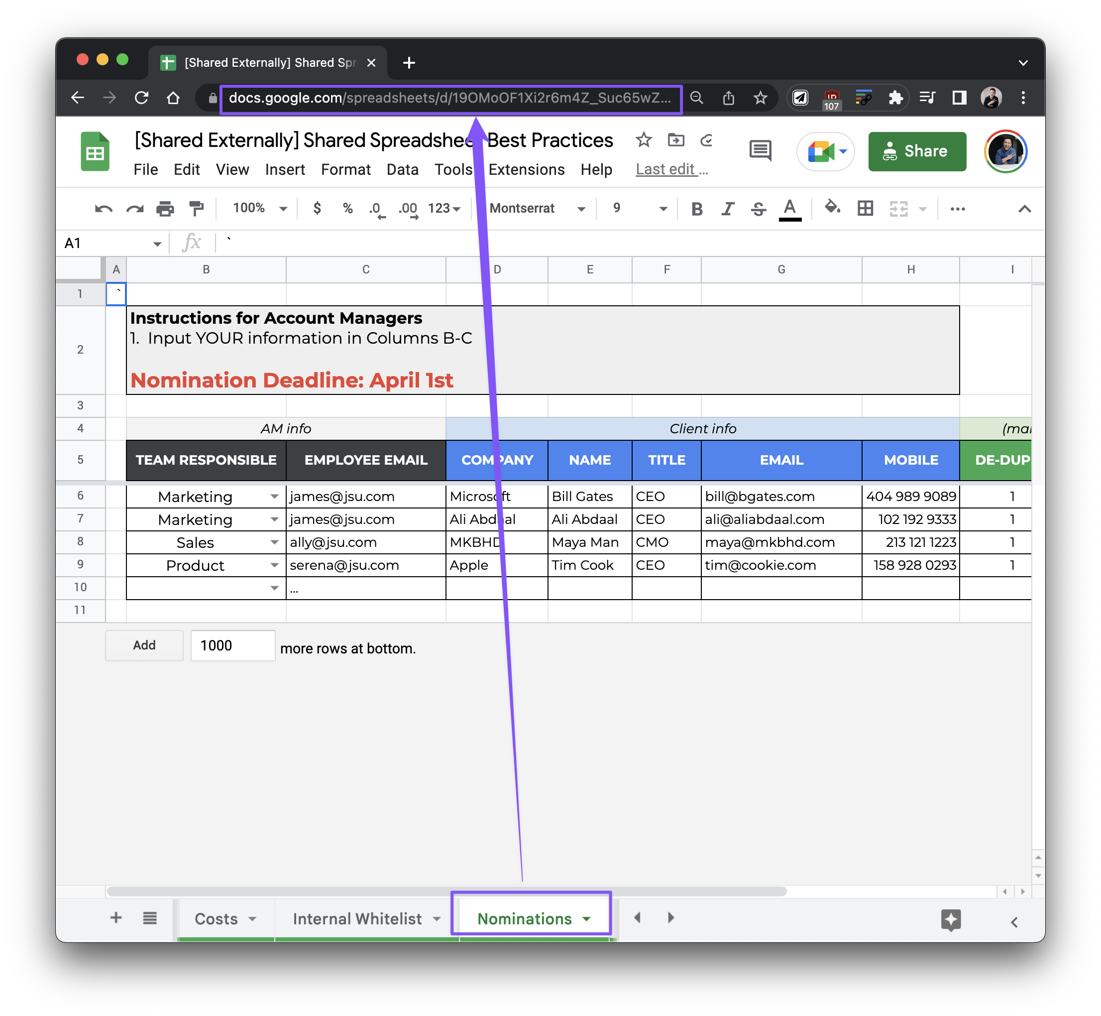 During team meetings or in follow-up emails, always hyperlink the spreadsheet with the appropriate URL