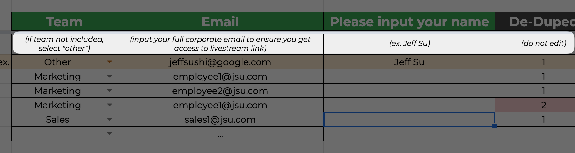 It’s helpful to include a row below your header that explains what should be filled in. I like to call this the example row, or the “helper row”.