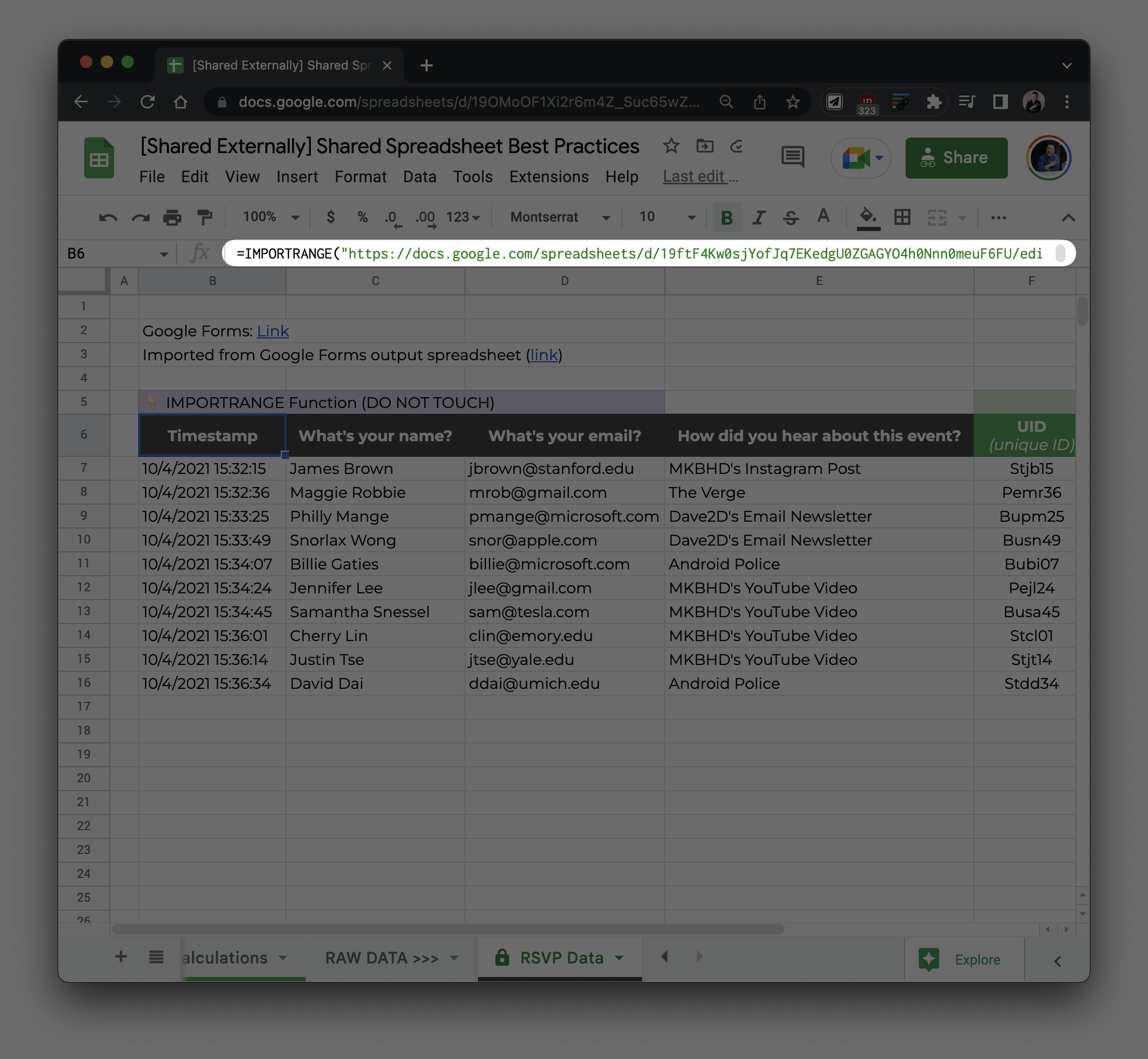 I recommend using the ImportRange function to import raw data. If someone were to accidentally overwrite the data, it won’t mess up your spreadsheet! I talk more about it here.