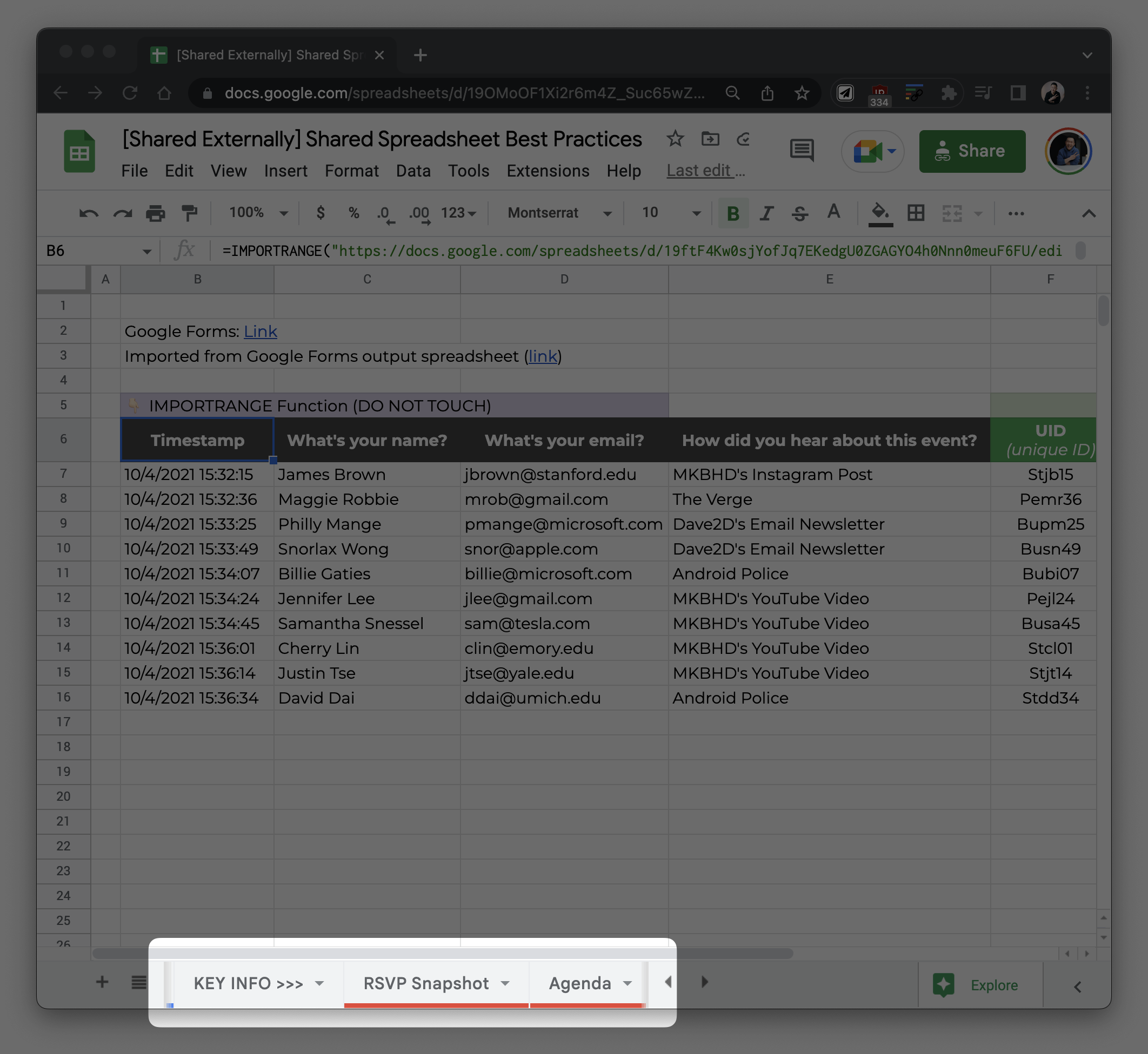 For an event, we might prioritize the number of sign ups and topics to be shared as the most important tabs. For more complex projects and spreadsheets, it’s good to have a “Read Me First” tab that breaks down instructions, definitions and links to relevant files.