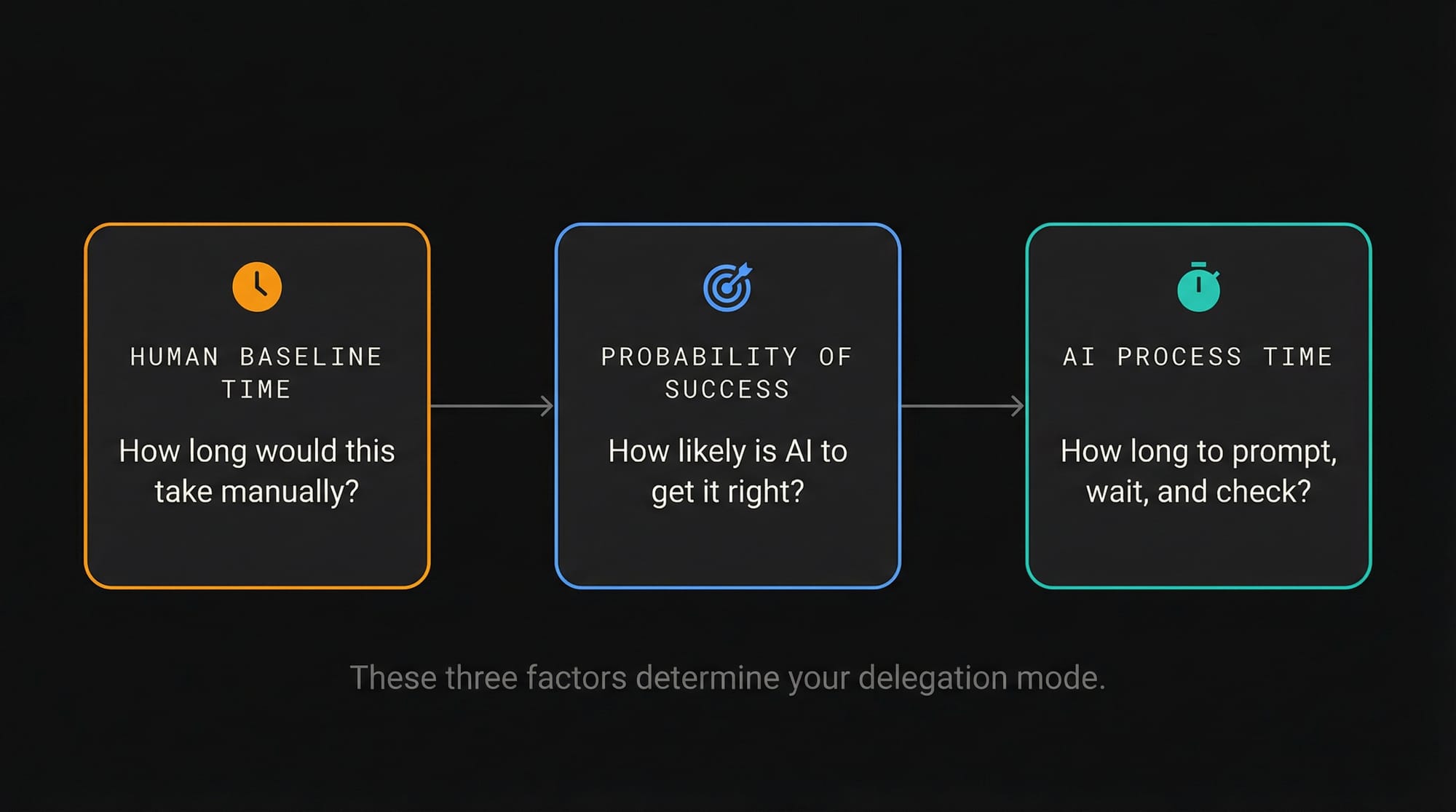 Professor Ethan Mollick of Wharton offers a useful framework for this called the "Agentic Cost-Benefit Equation." It comes down to three factors: