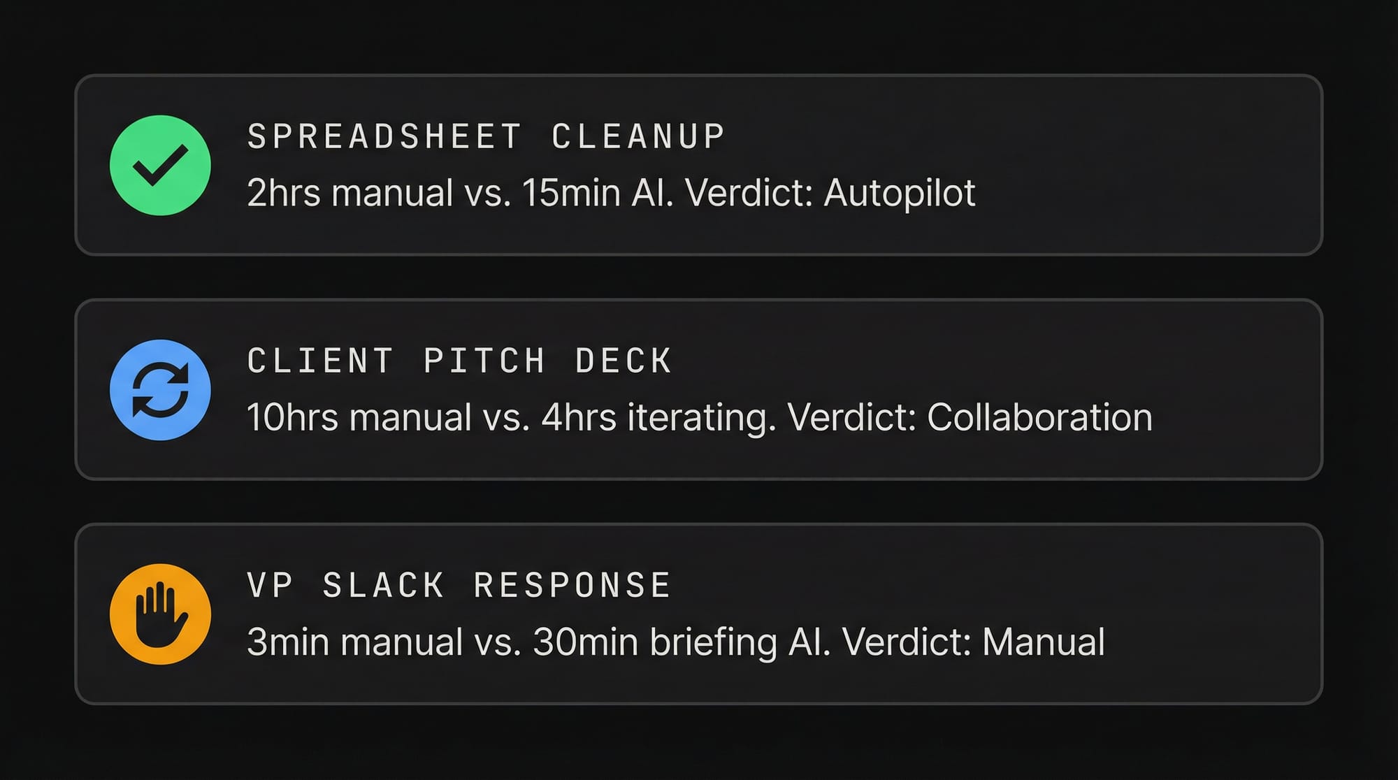 The math is clear: 15 minutes beats two hours, and you know this domain well enough to catch major errors at a glance. Result: Autopilot Mode.