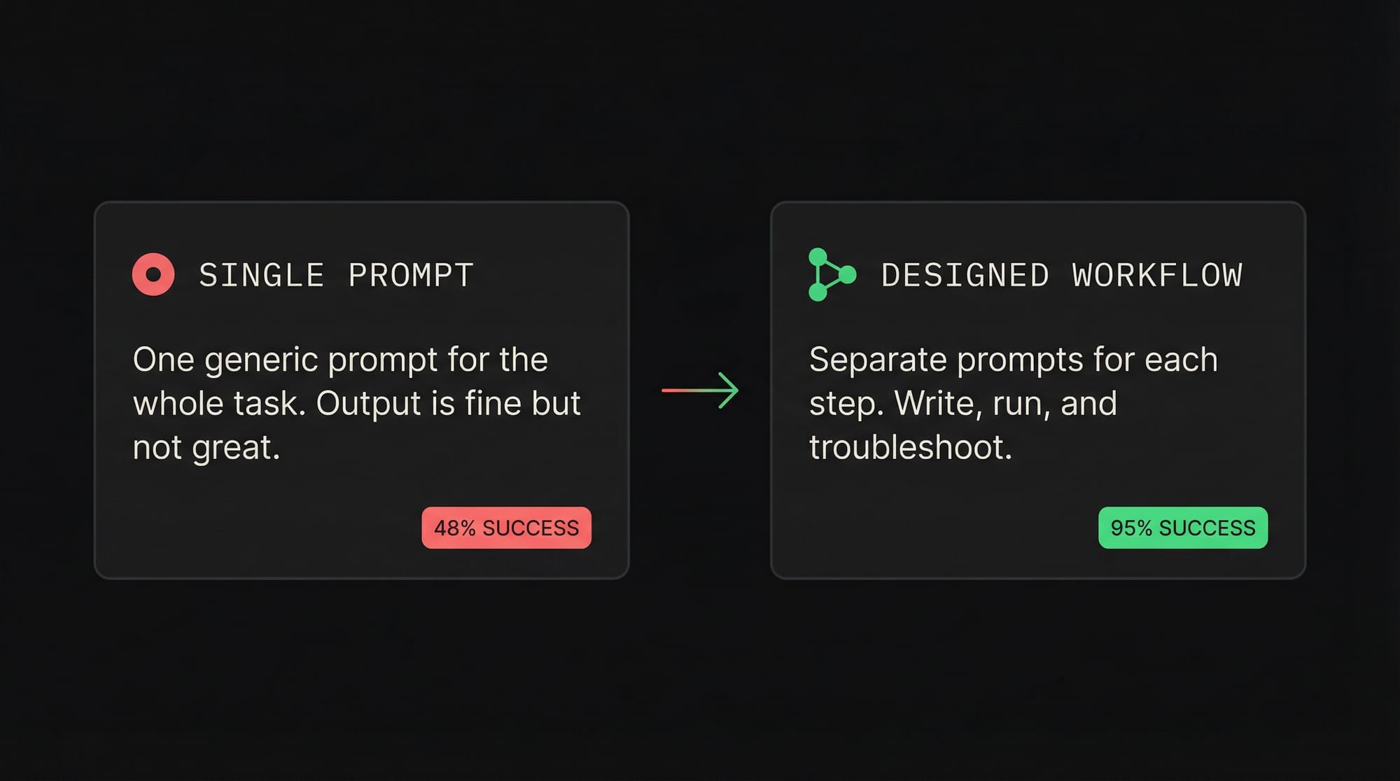 But when he designed a multi-step workflow to write, run, and troubleshoot the code using the same AI model, the success rate jumped to 95%. The variable was not the model. It was the process.