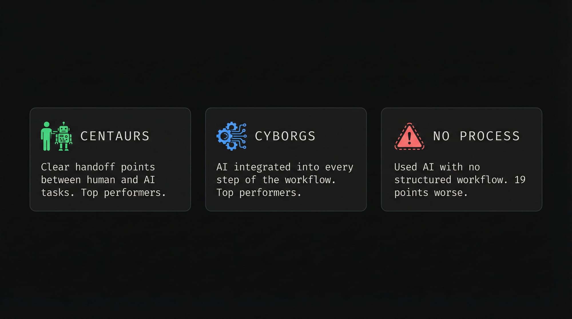 "Centaurs," who divided tasks between themselves and AI with clear handoff points; and