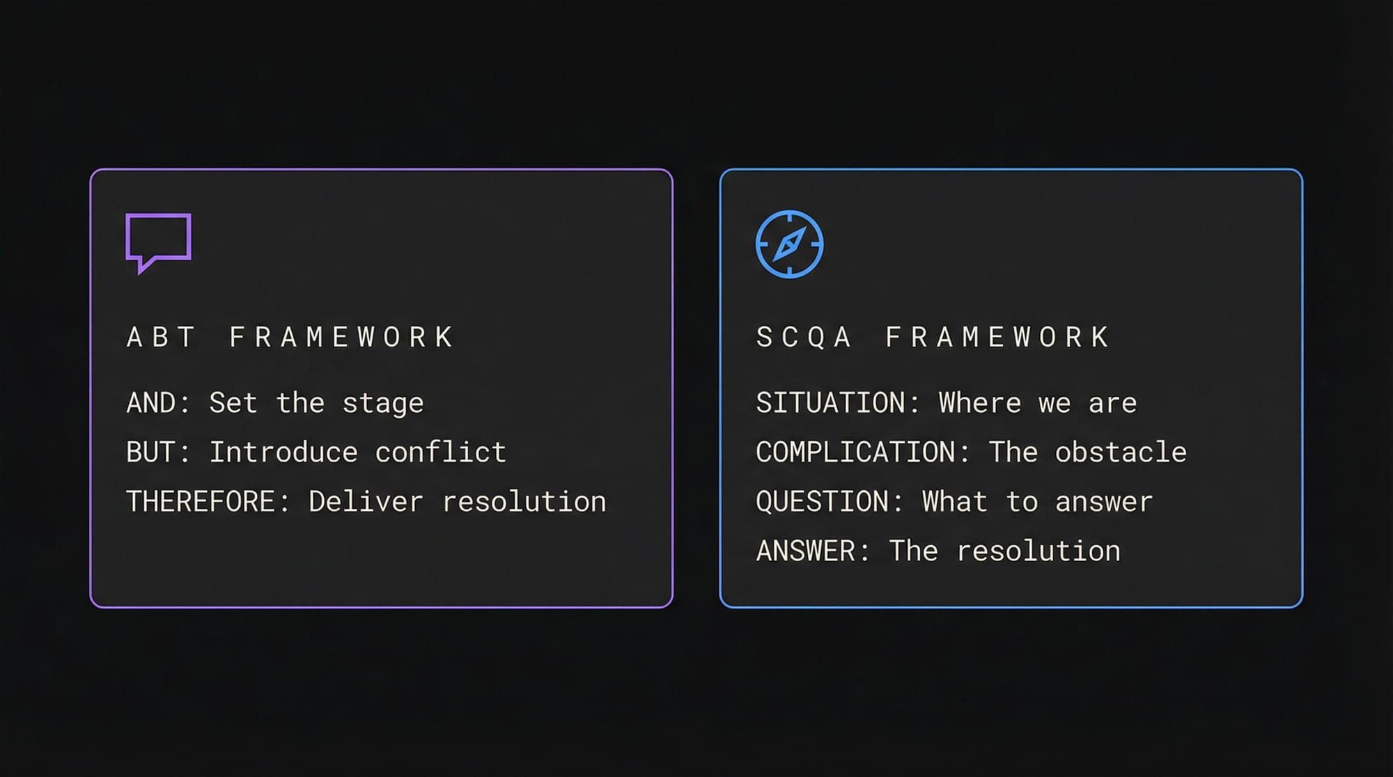 The SCQA Framework (Situation, Complication, Question, Answer), used at McKinsey, Bain, and BCG, follows the same underlying principle.