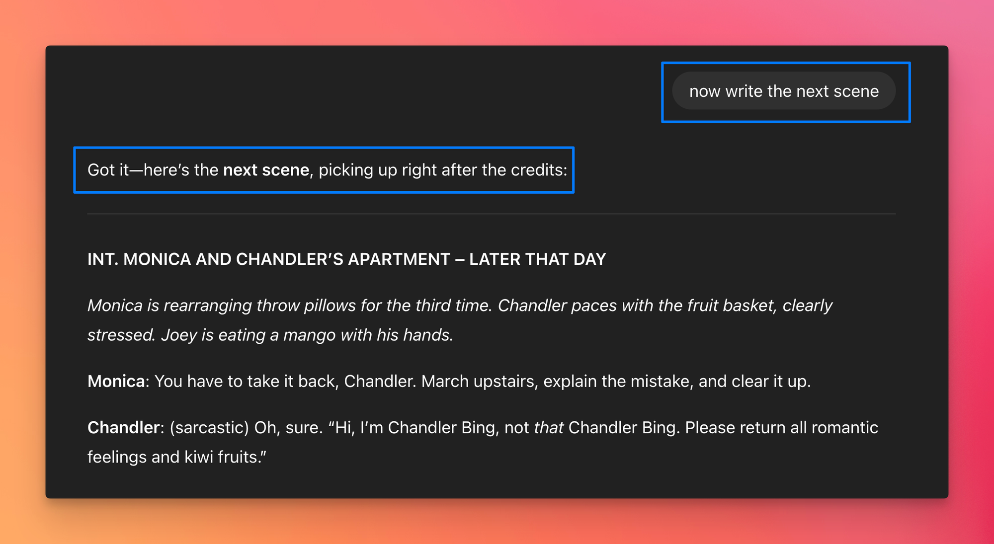 Here's a simple analogy. When you ask ChatGPT to write the opening scene of a TV show and then ask it to write the next scene in the same conversation, it remembers the characters, setting, and narrative. Everything stays consistent.