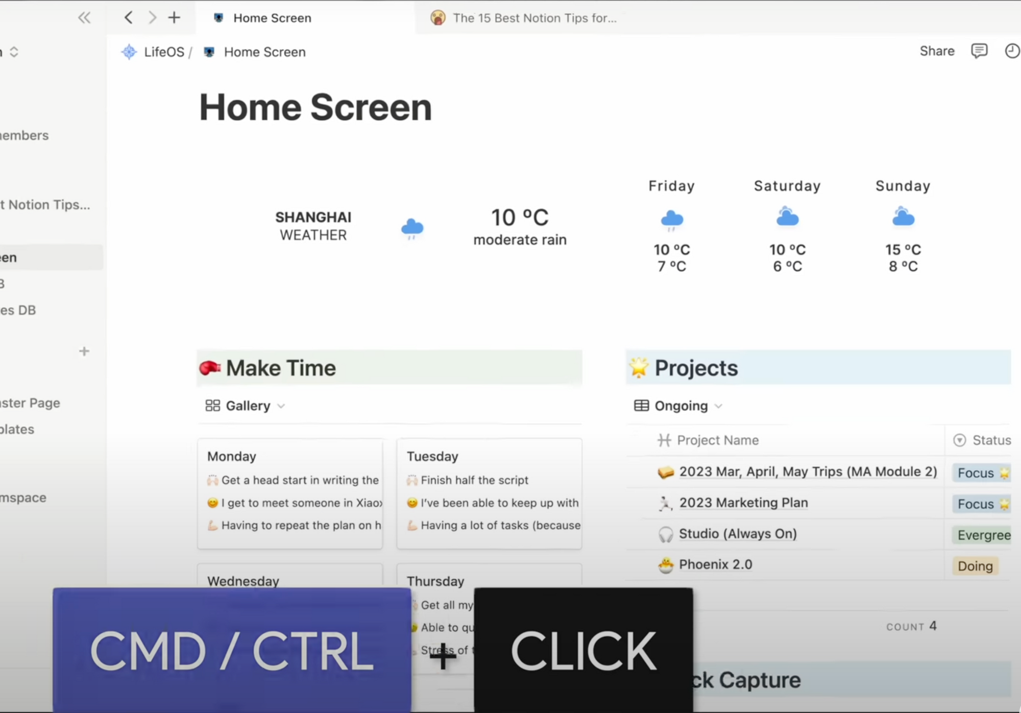 I usually have 3 tabs open at all times: my home screen, the project I’m focusing on for the day, and a flexible tab where I use CMD + P to search for pages I need to browse for information.