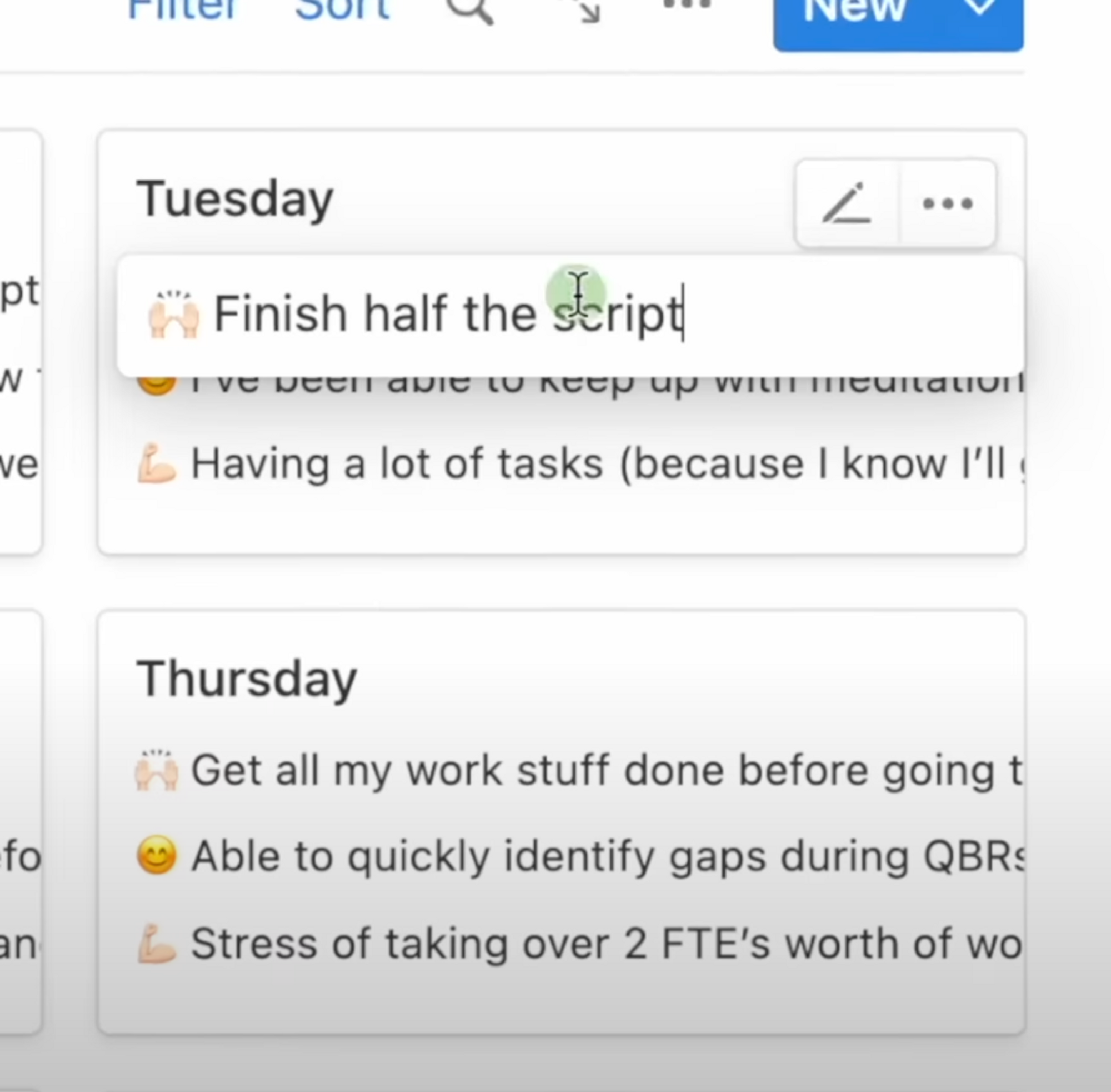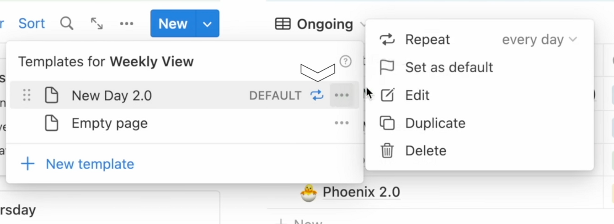 You can see that my “New Day 2.0” template is a recurring one, meaning Notion automatically generates an empty New Day 2.0 page everyday at 5AM. So by the time I wake up and sit down to plan my day, I have an empty page ready to go.