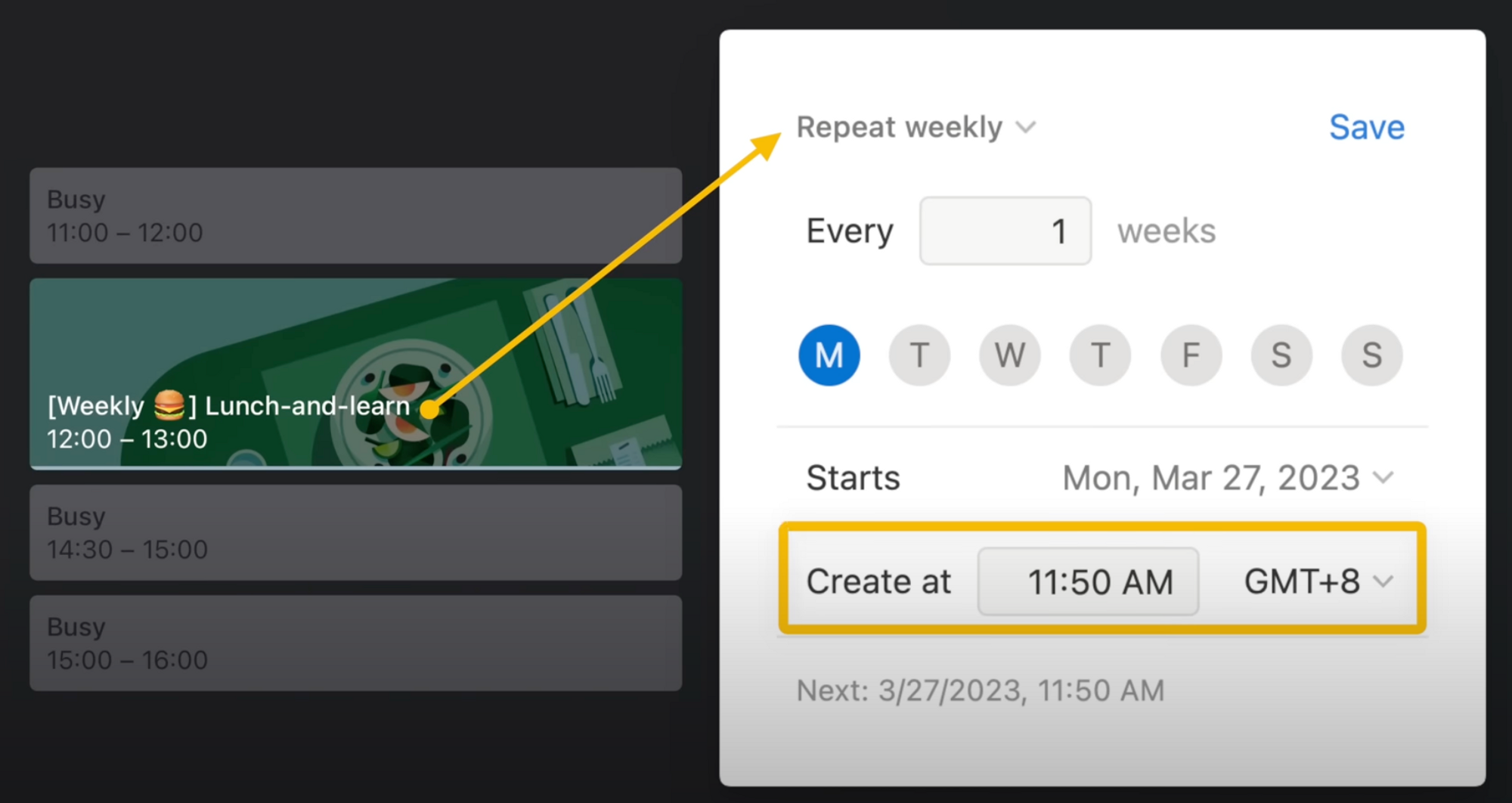 The idea is to use these repeating templates with recurring actions, like weekly meetings. Set the template to be generated 10 minutes before each meeting so you can start taking notes right away.