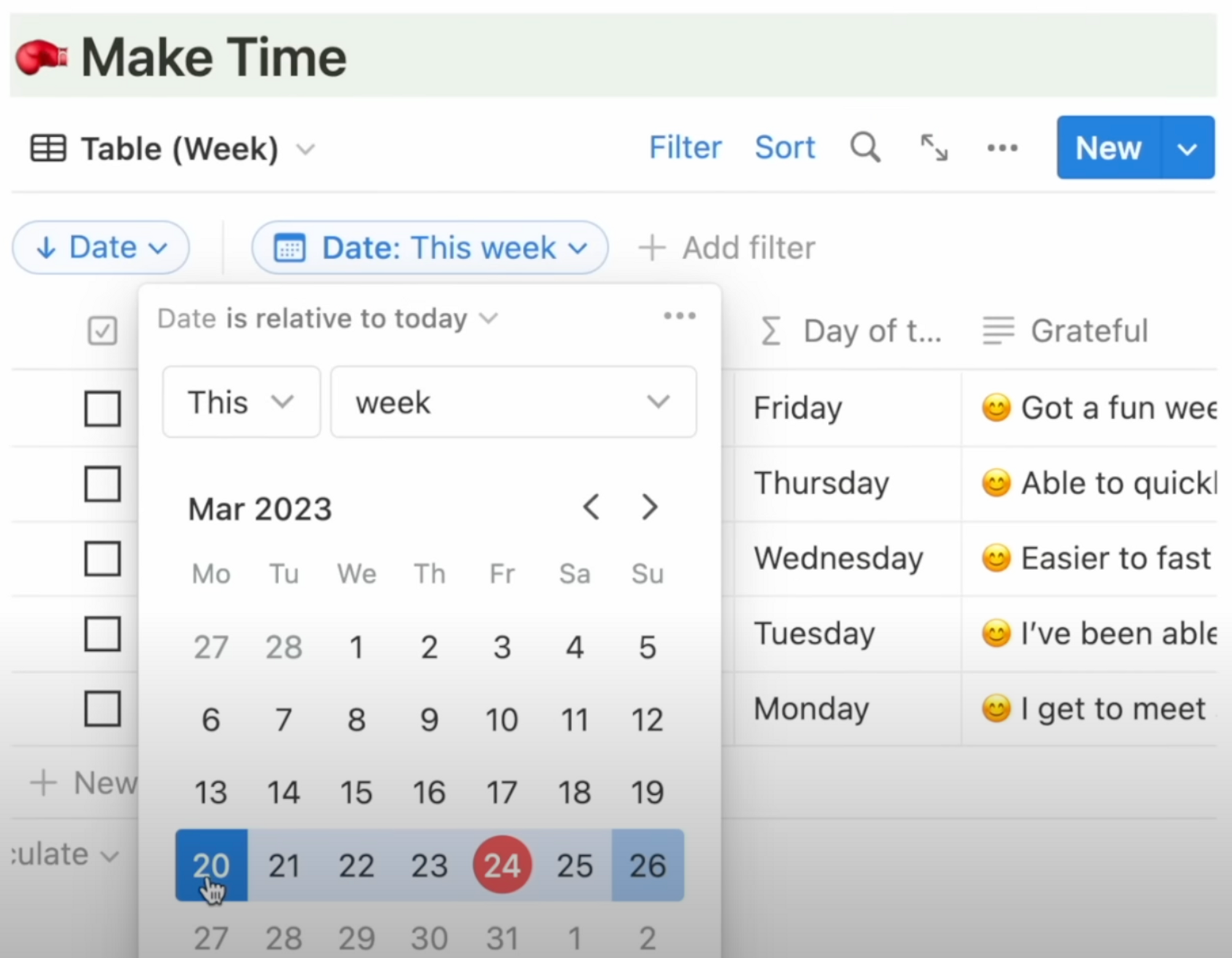 For databases with the “Date” property, you can actually create a view and include the filter: Date, relative to today > This Week, so you only see pages where the date falls within this current week.