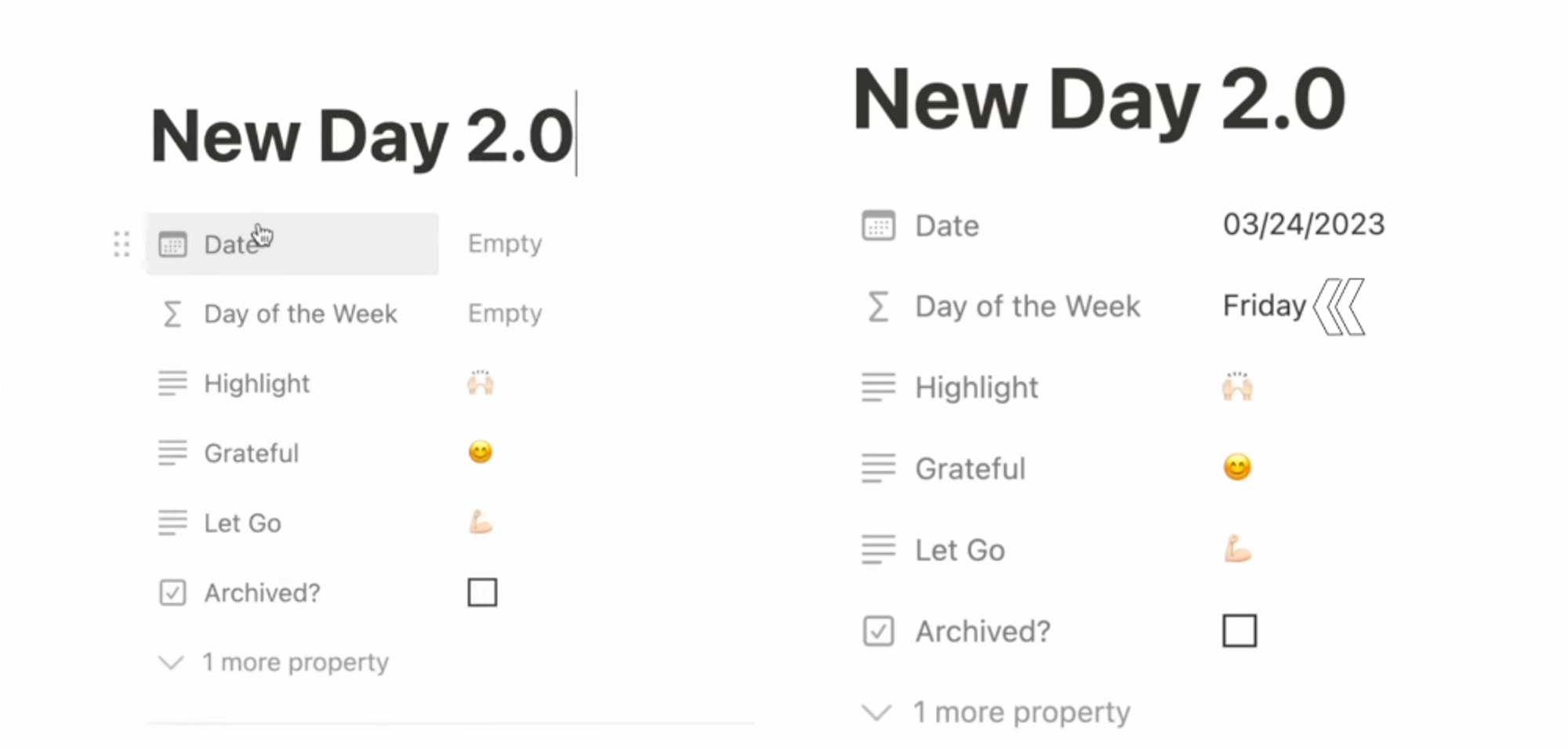If I create a new page in my weekly agenda database, you see both the date and the day of the week are empty, right? I select the date to be today, and magically the Day of the Week field populates as well.