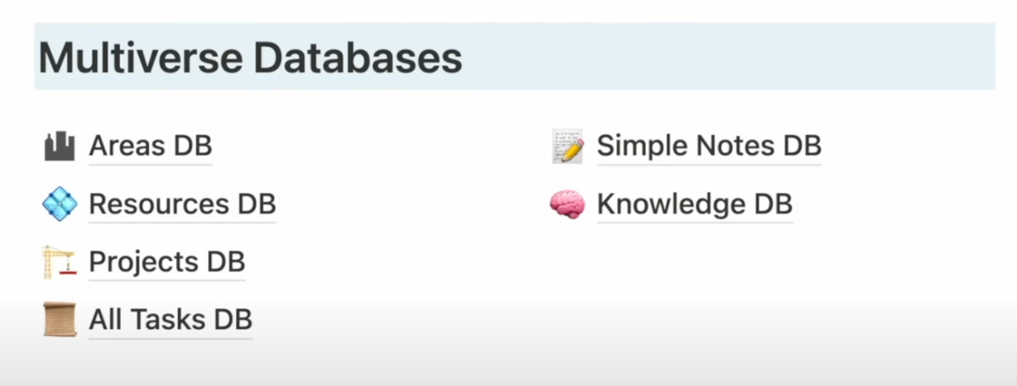 Moving onto organizational best practices, in my LifeOS dashboard I have a section that houses all my “master” databases.