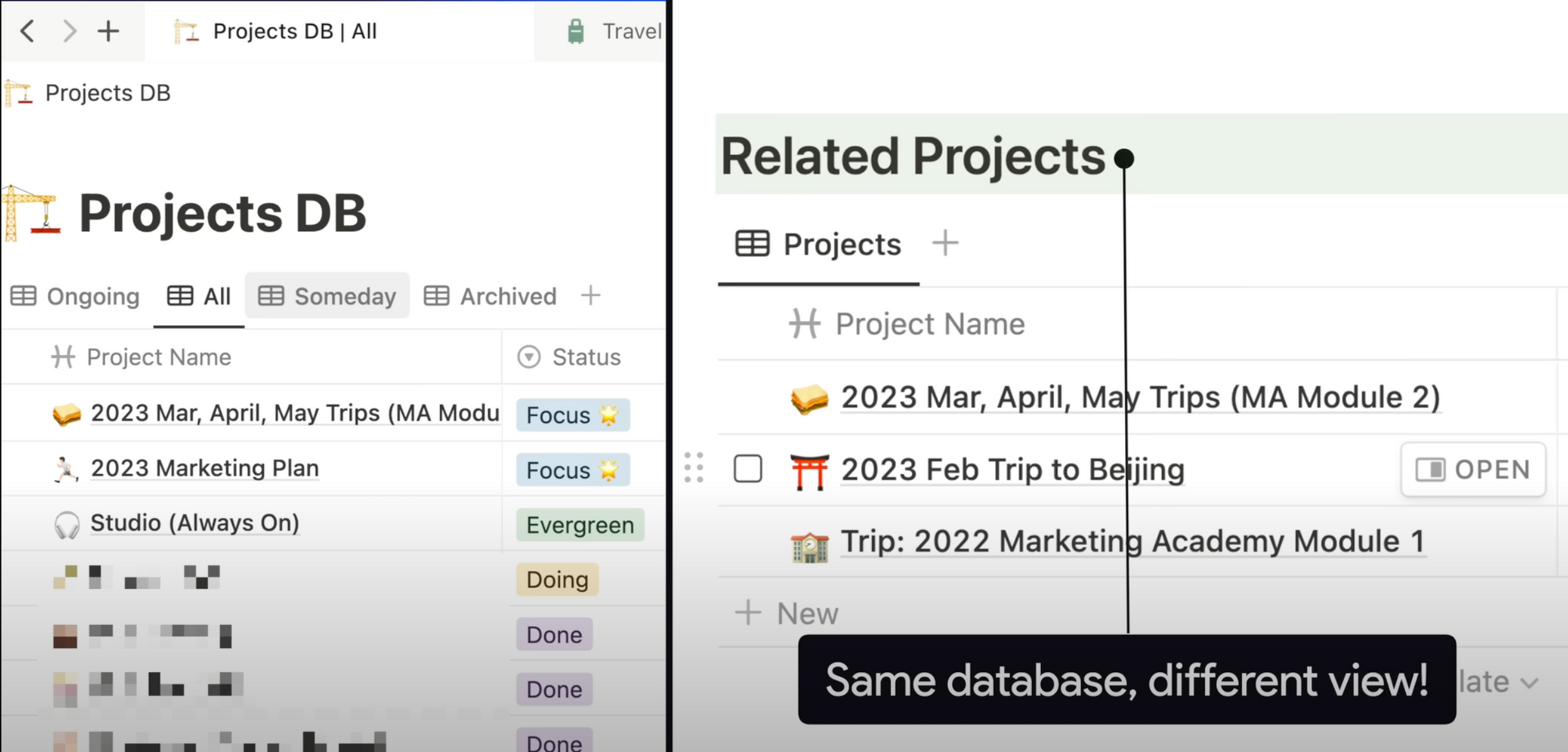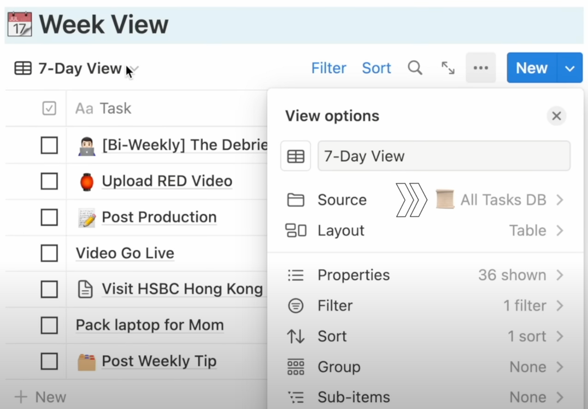 For example, on my home screen, the source of the week view here is my All Tasks database, and it’s filtered for a 7-day view. If I go into one of my projects, this Current Tasks view also draws from my All Tasks database, but filtered for this project specifically.