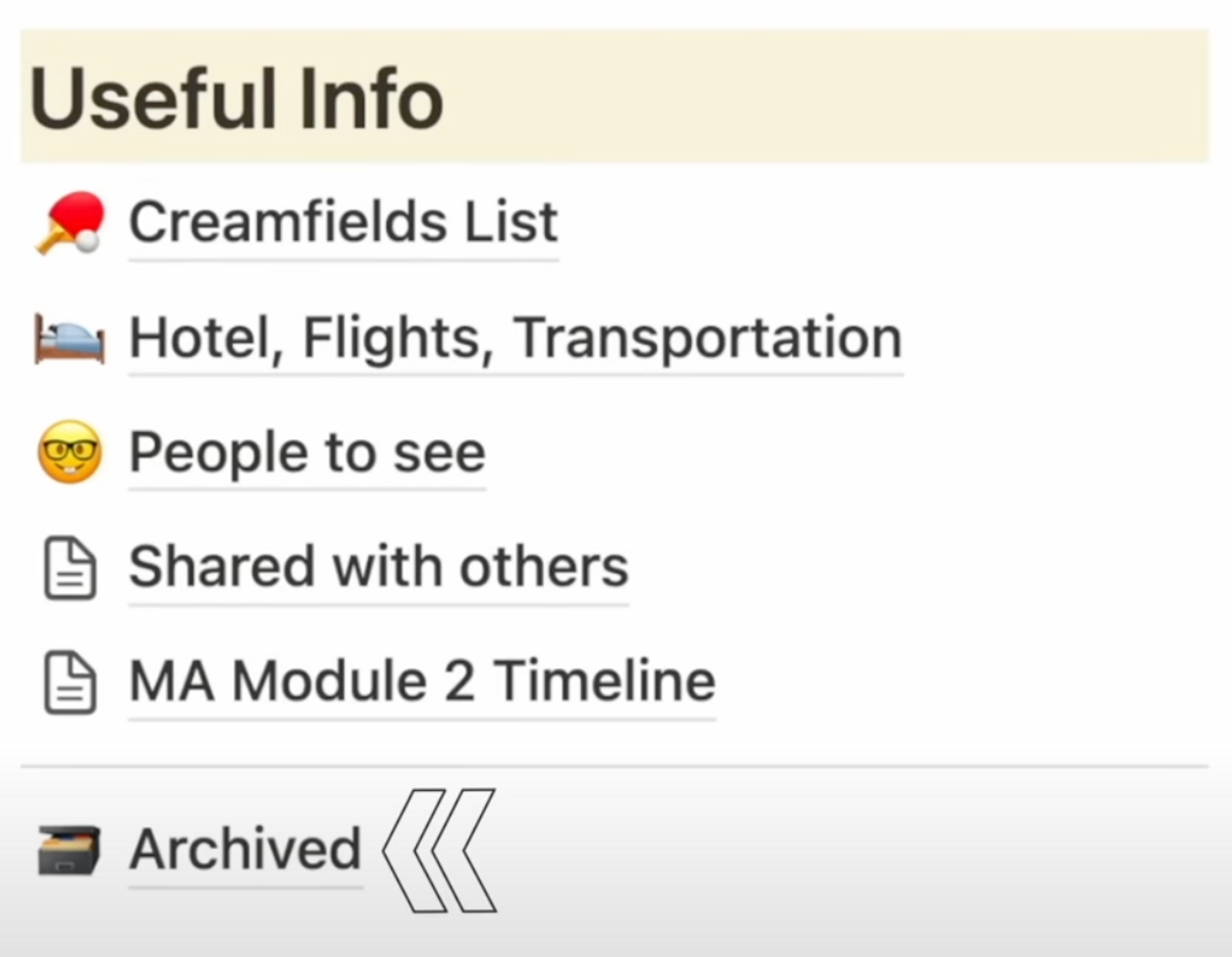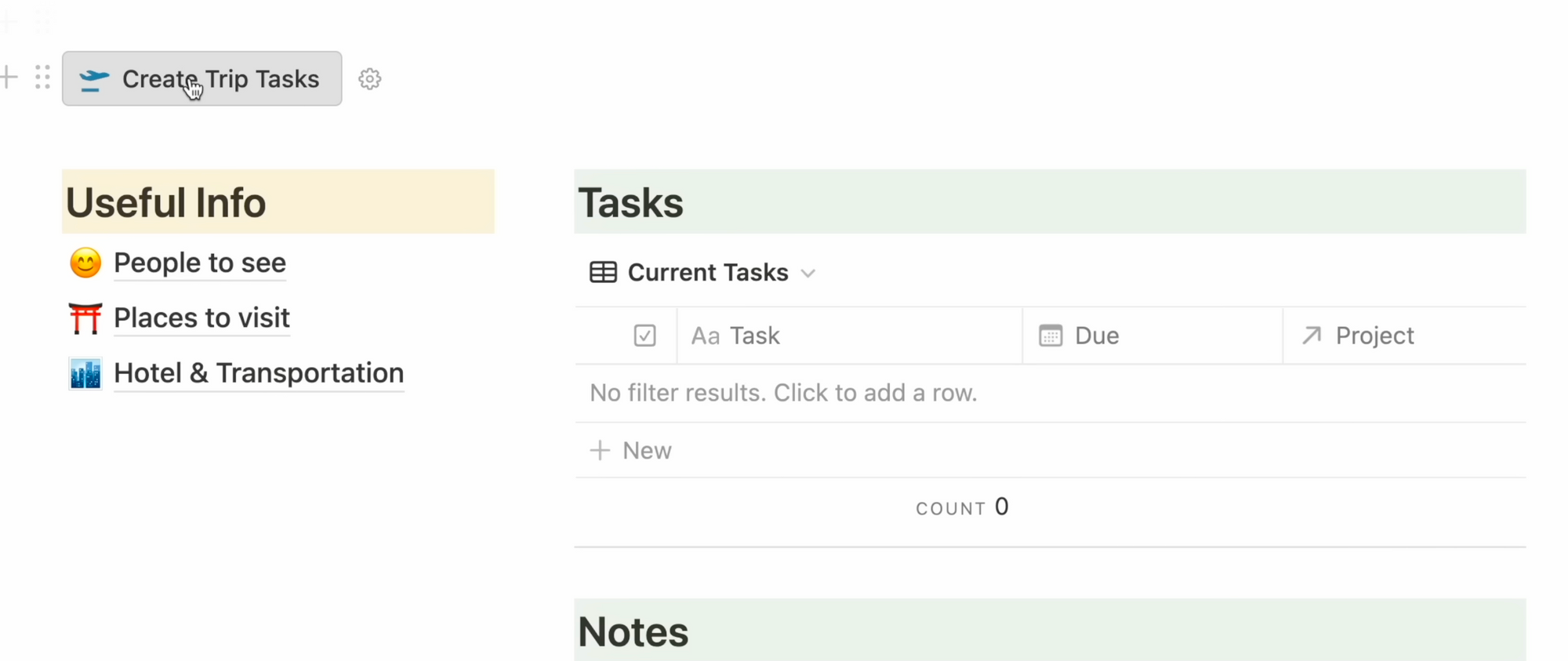 This new Buttons feature and it’s a complete game-changer. For example, I have a trips template within my Projects Database. In the useful info section, I include these pages by default to remind myself to visit friends, family, and interesting places whenever I travel.