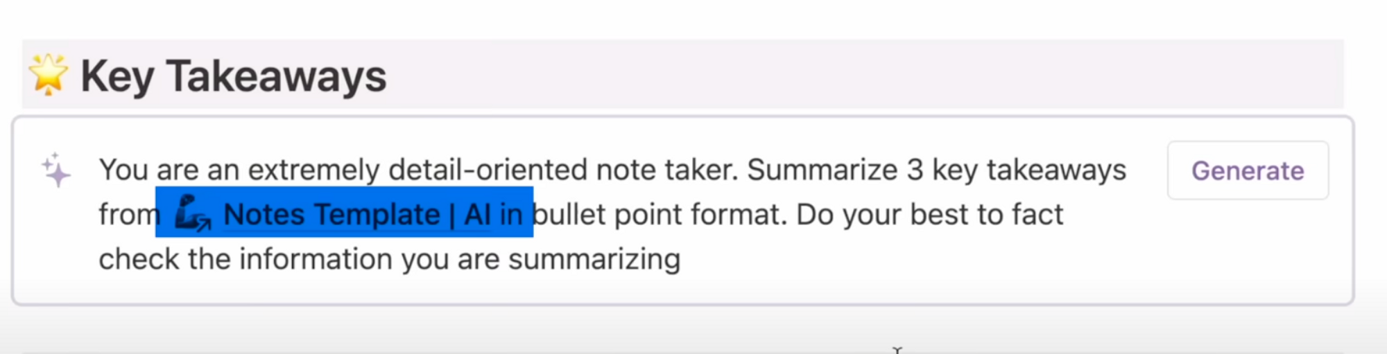 I used a bit of role prompting: You are an extremely detail-oriented note taker. Summarize 3 key takeaways from Notes Template | AI in bullet point format. Do your best to fact check the information you are summarizing.=