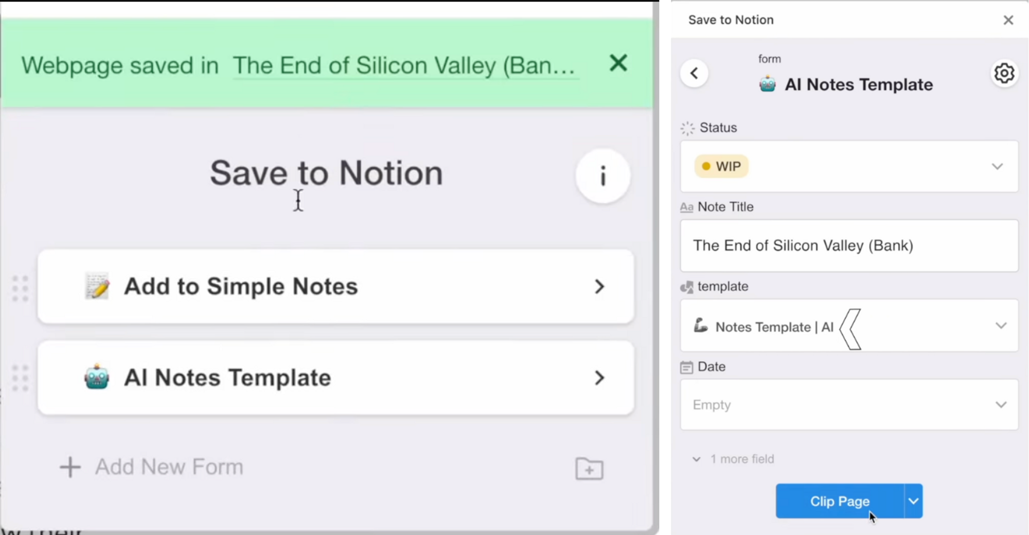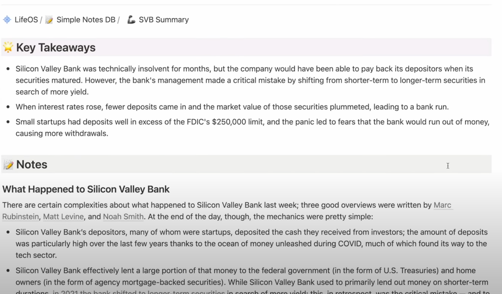 Now, imagine I created a new page using the AI notes template, I take some notes from this article on Silicon Valley Bank in the notes section, I click generate in the custom AI block, and the AI-generated summary is a bit oversimplified but it definitely captures the main points.