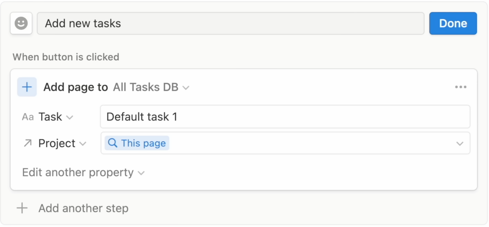 To get started: write /button > name it, then you want to add a page to an existing database, for me it’s my all tasks database, and this is the most important part, you want to make sure the related project property is this current page. This ensures all the tasks created by this button is for this project specifically.