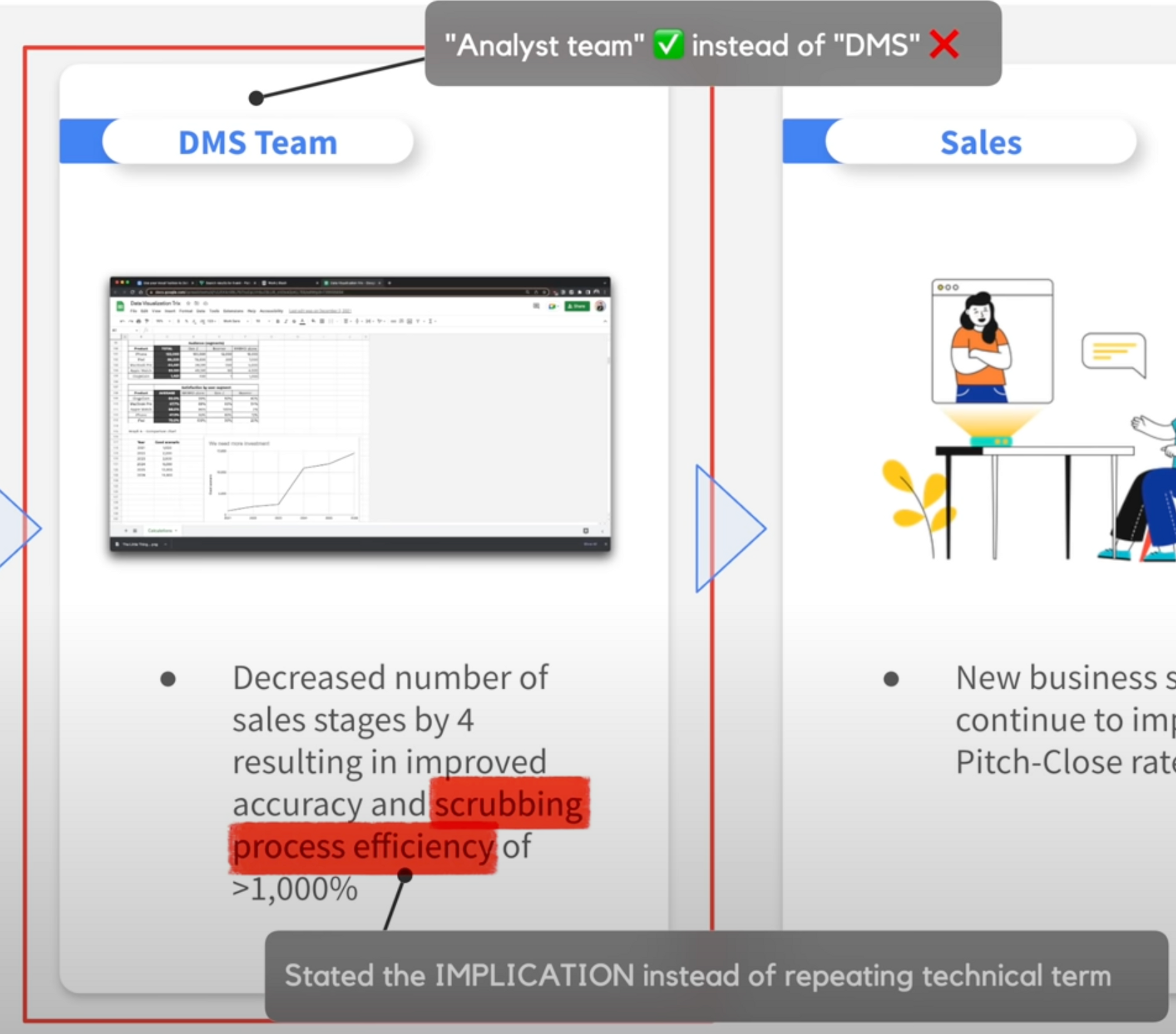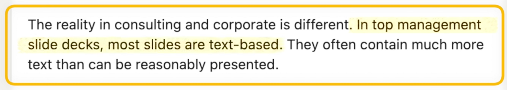 Here’s a simple test I learned back in my management consulting days: if you share your slides with a stranger and they’re able to make sense of it by just clicking through the slides, there’s too much information, because the slides should not make sense without you, the presenter.