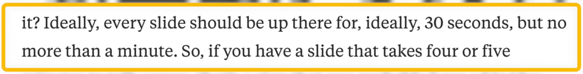 HBR also emphasizes the optimal duration for each slide: a concise 30-60 seconds. This keeps the audience engaged with fresh, visually stimulating content.