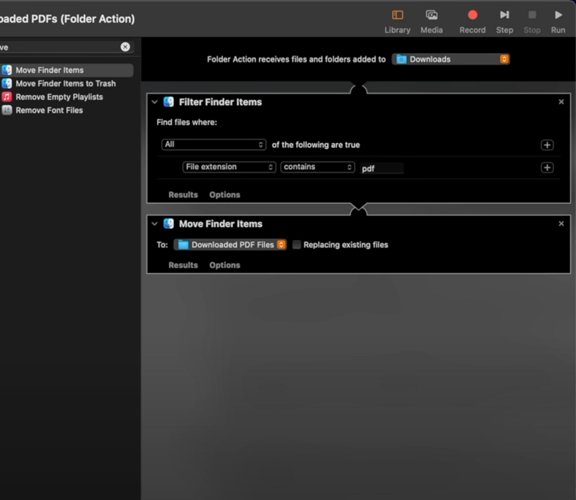 You can now press CMD+S to save this folder action, I’ve named mine “Move Downloaded PDFs,” and now, go online, download a PDF file, and if everything was done correctly, the pdf should move automatically to the destination folder you selected.