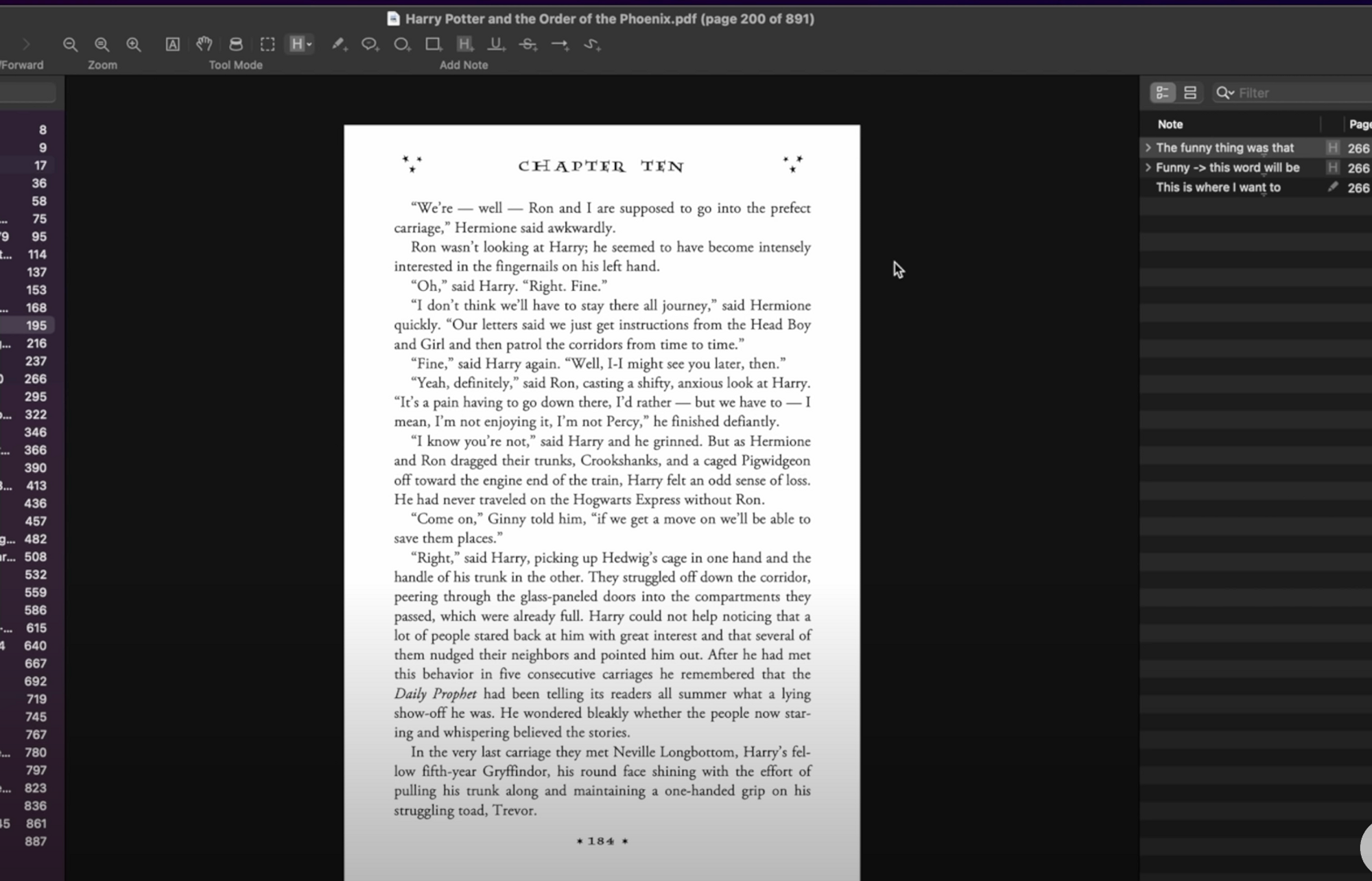 I can highlight a specific passage with the highlight tool and add a note. With this note tool, if I press CMD+SHIFT+N, we can see all the highlights and notes I’ve created, and double clicking in one note lets you jump to that page immediately.