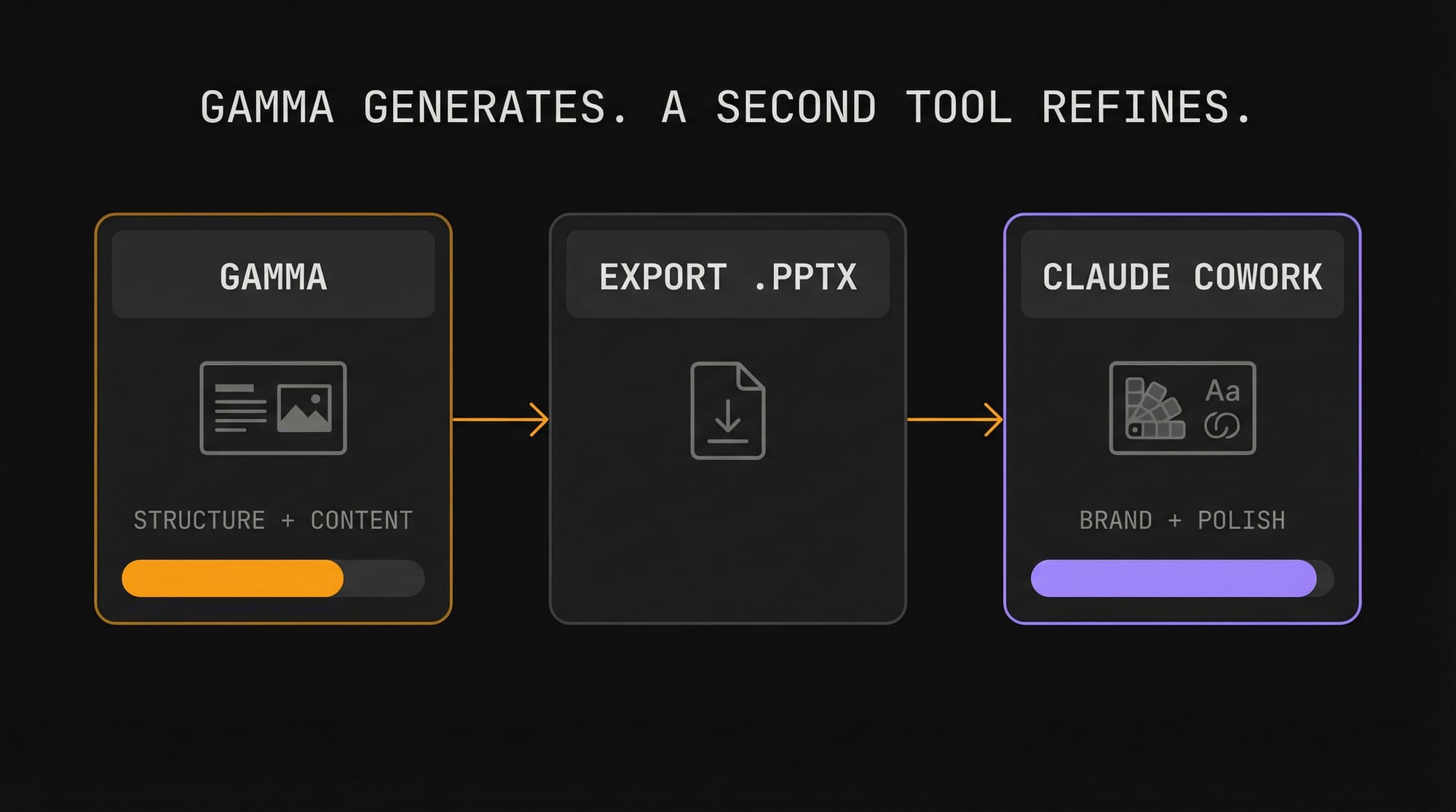 After downloading your Gamma presentation as a PowerPoint, you can use Claude Cowork to visually refine the deck using your own brand guidelines saved locally through the Skills feature. This is out of scope for this walkthrough (let me know if you want a tutorial on this), but it is the natural next step for anyone who needs brand-consistent output.