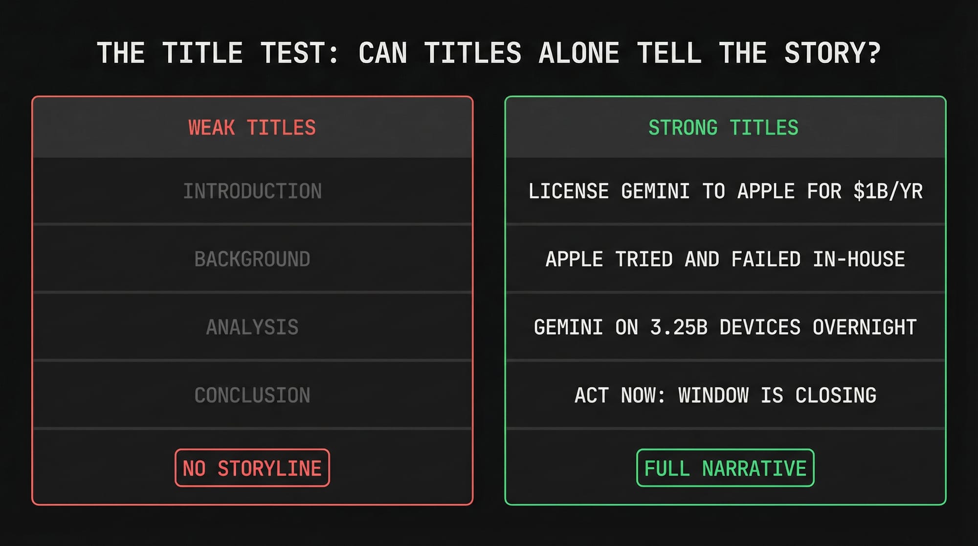 The feedback: The VP of Corporate Development says the "Apple Can't Build This Alone" slide has three columns with equal visual weight, but the argument has a clear hierarchy. Columns 1 and 2 are context. Column 3 is the punchline: competitors are eliminated and Google is the last partner standing. The visual needs to make that obvious.